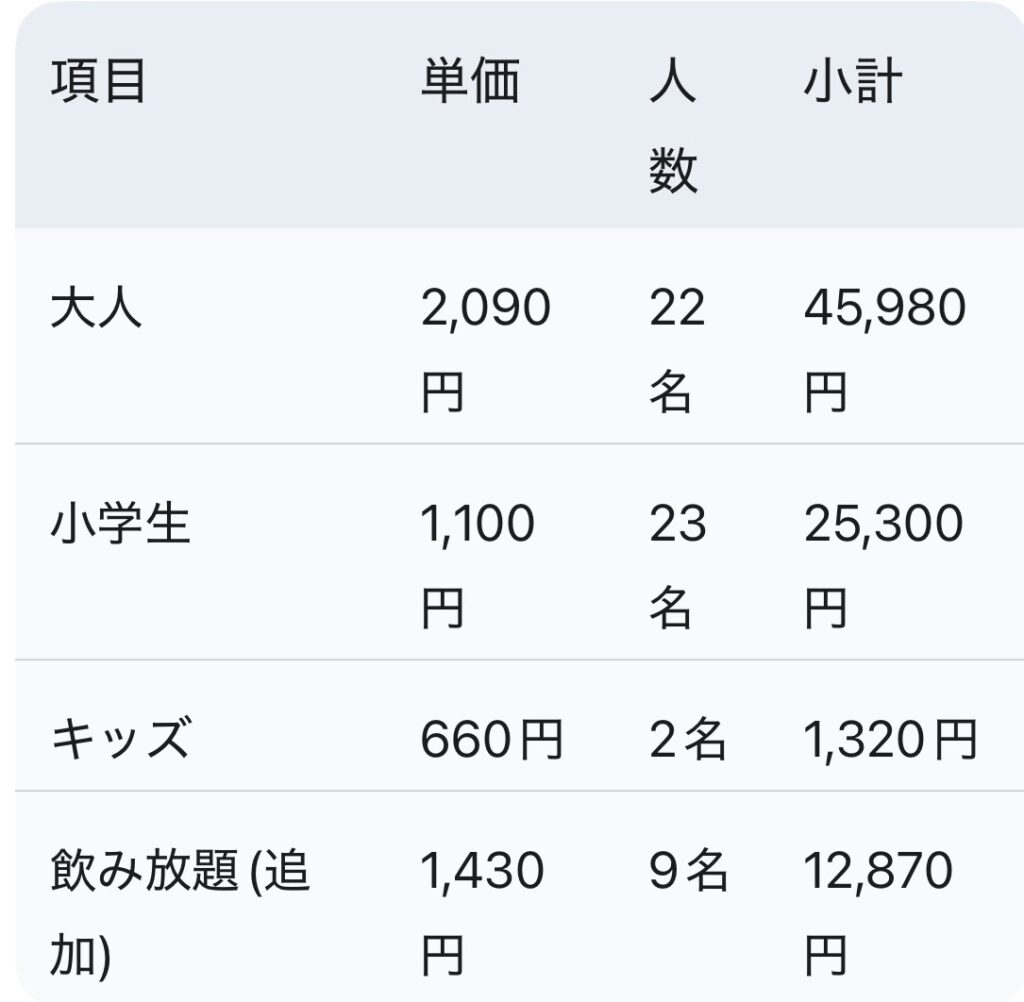 スポーツチームの打ち上げでは、以下のように年齢や条件によって料金が変わるケースがほとんどです。